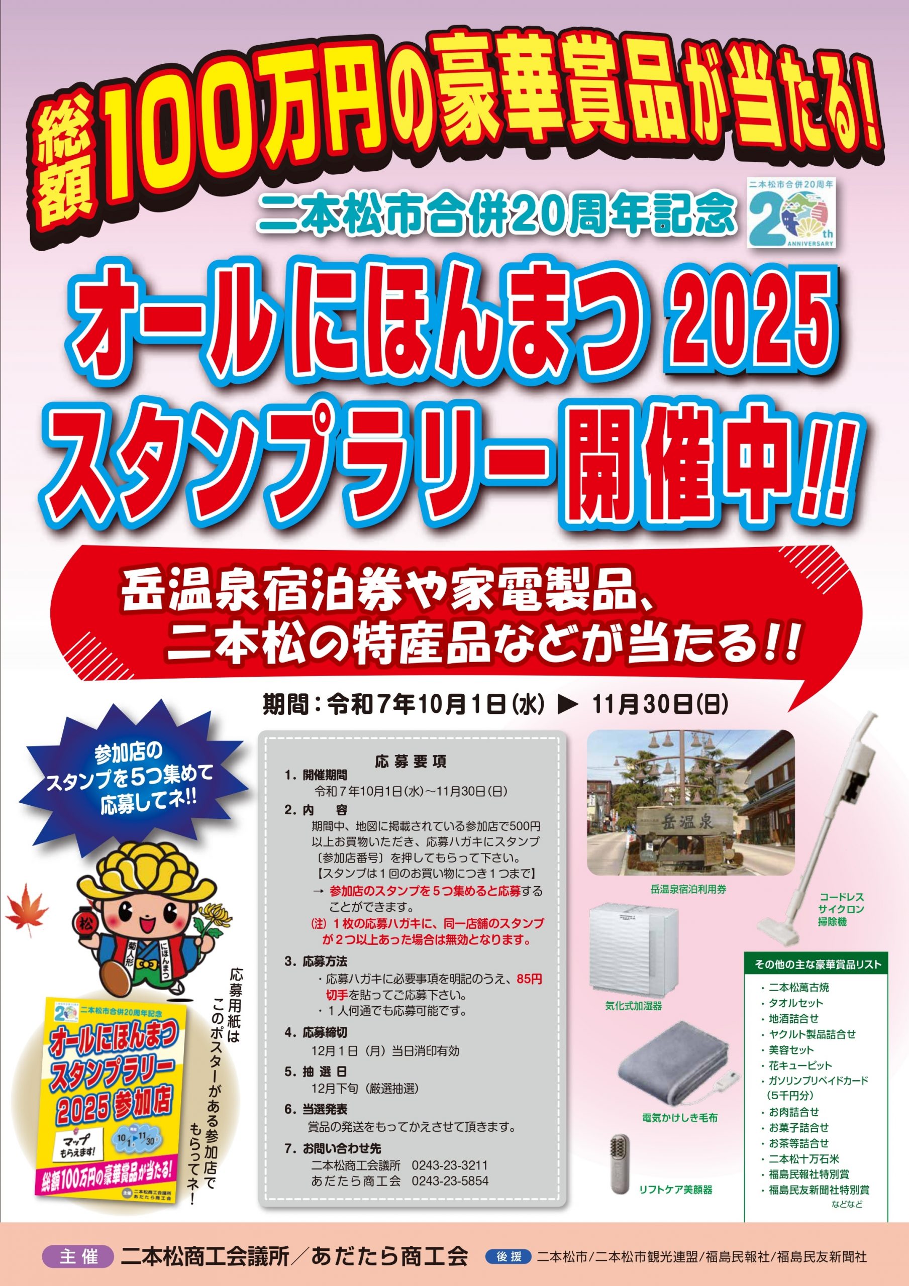 岳温泉宿泊券や家電製品、二本松の特産品など豪華賞品が抽選で当たりますので、奮ってご応募下さい。