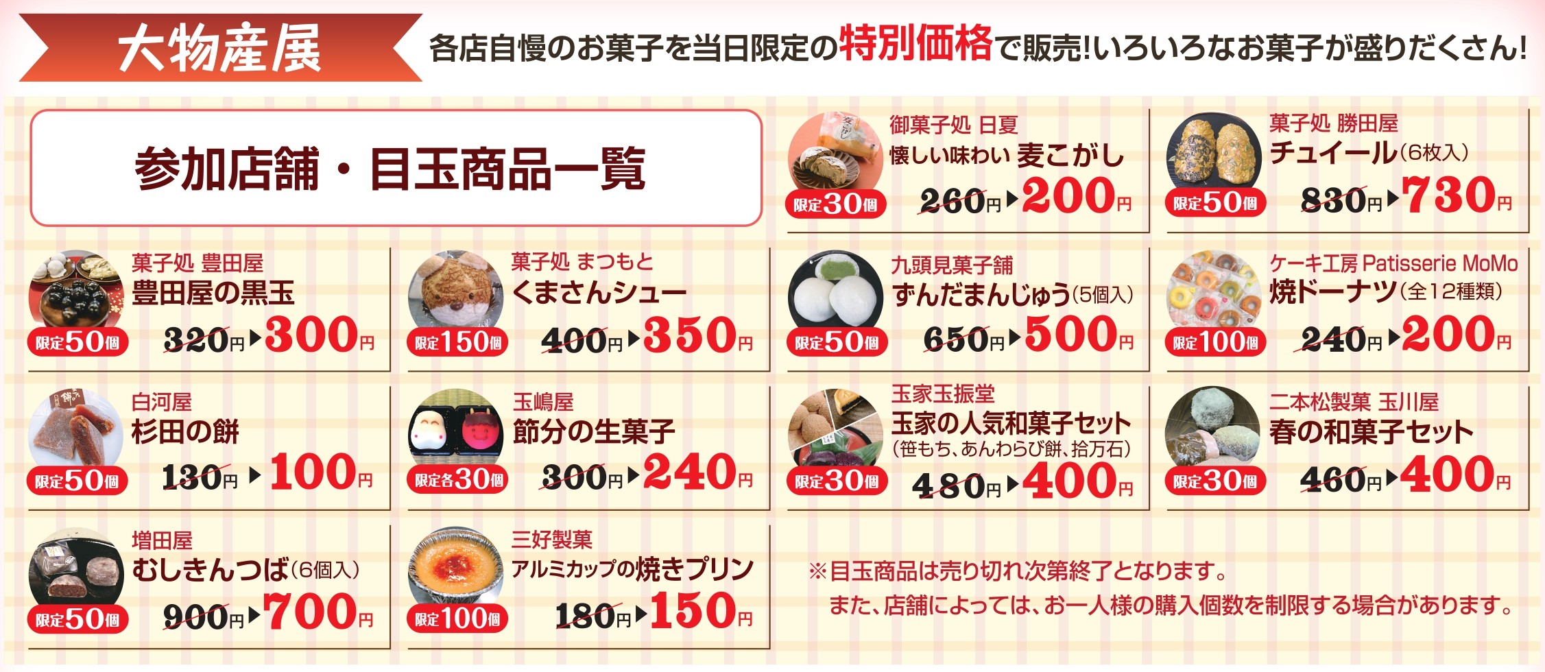 各店自慢のお菓子を当日限定の特別価格で販売します。いろいろなお菓子が盛りだくさん!この機会に今まで食べたことのないお菓子を食べて、お気に入りのお菓子を見つけて下さい。
